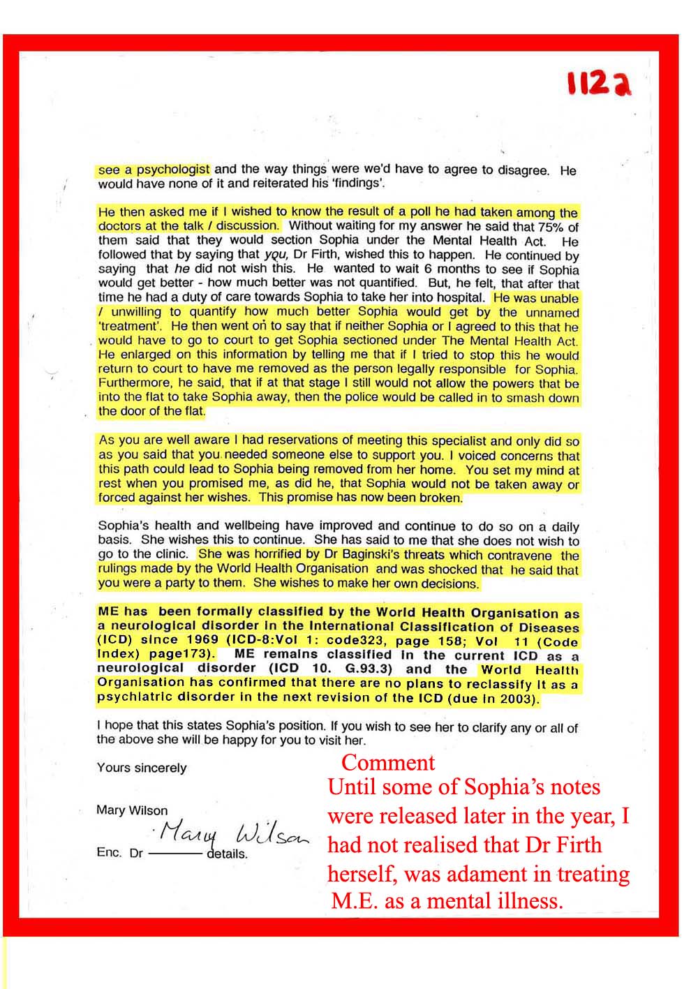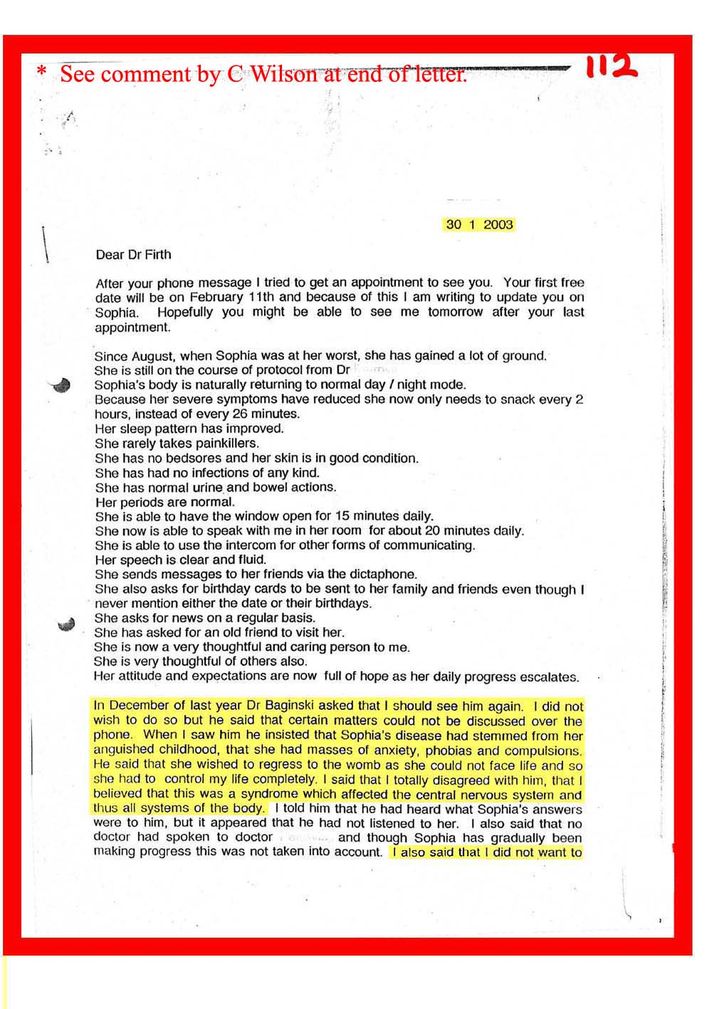 DOC.No. 112 (Mrs.Wilson - Dr Firth, update on Sophia and interview by Dr Baginski)