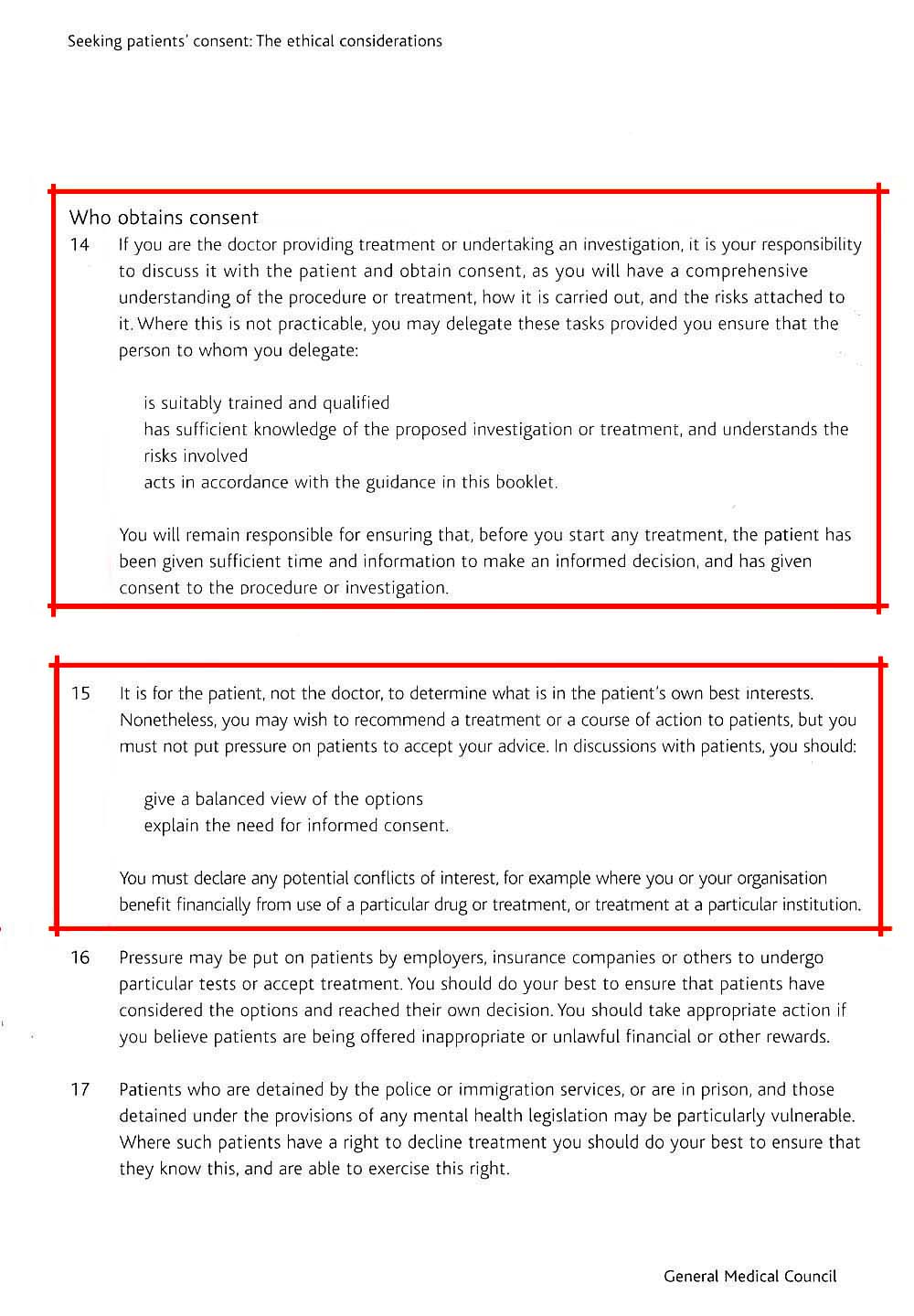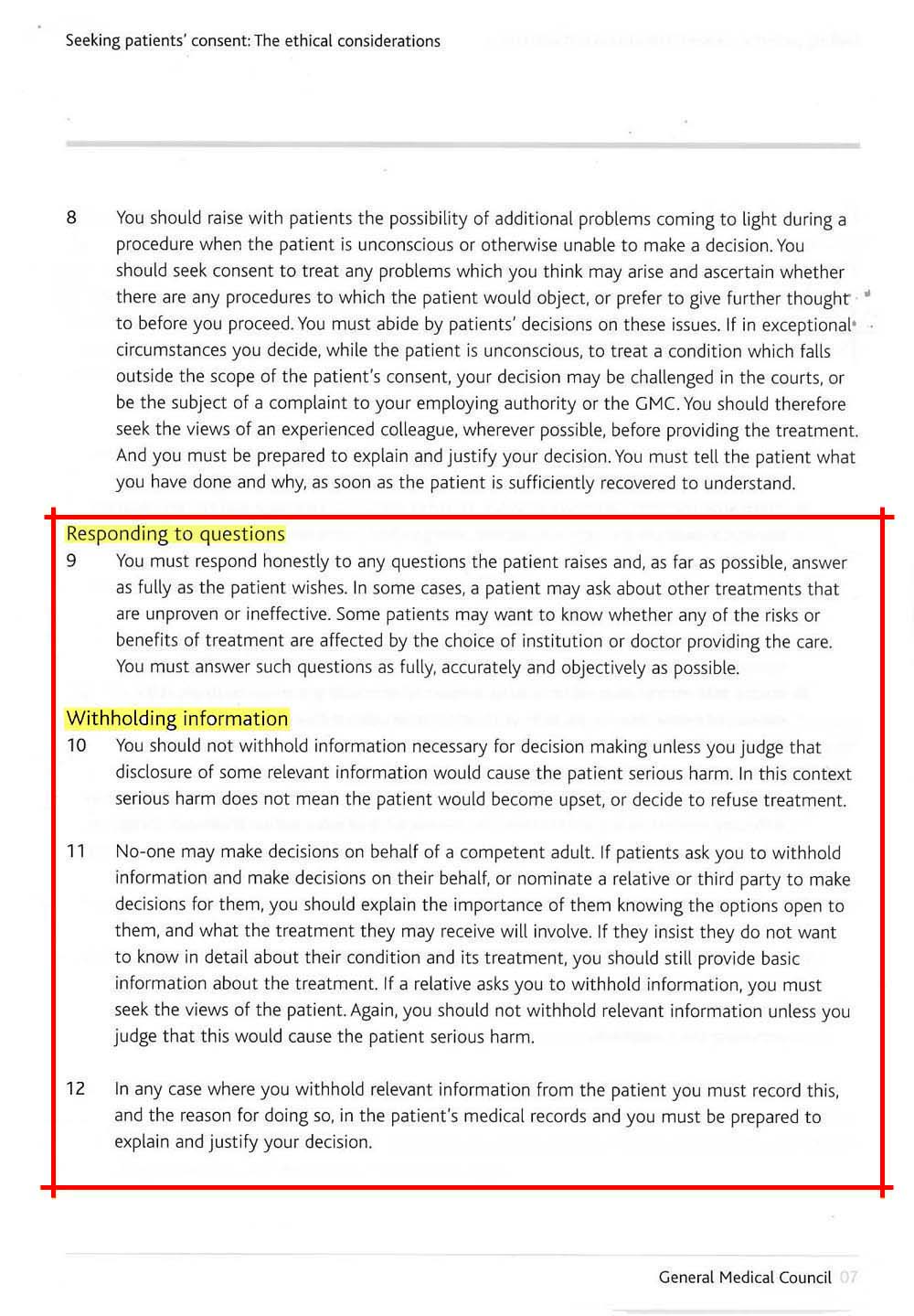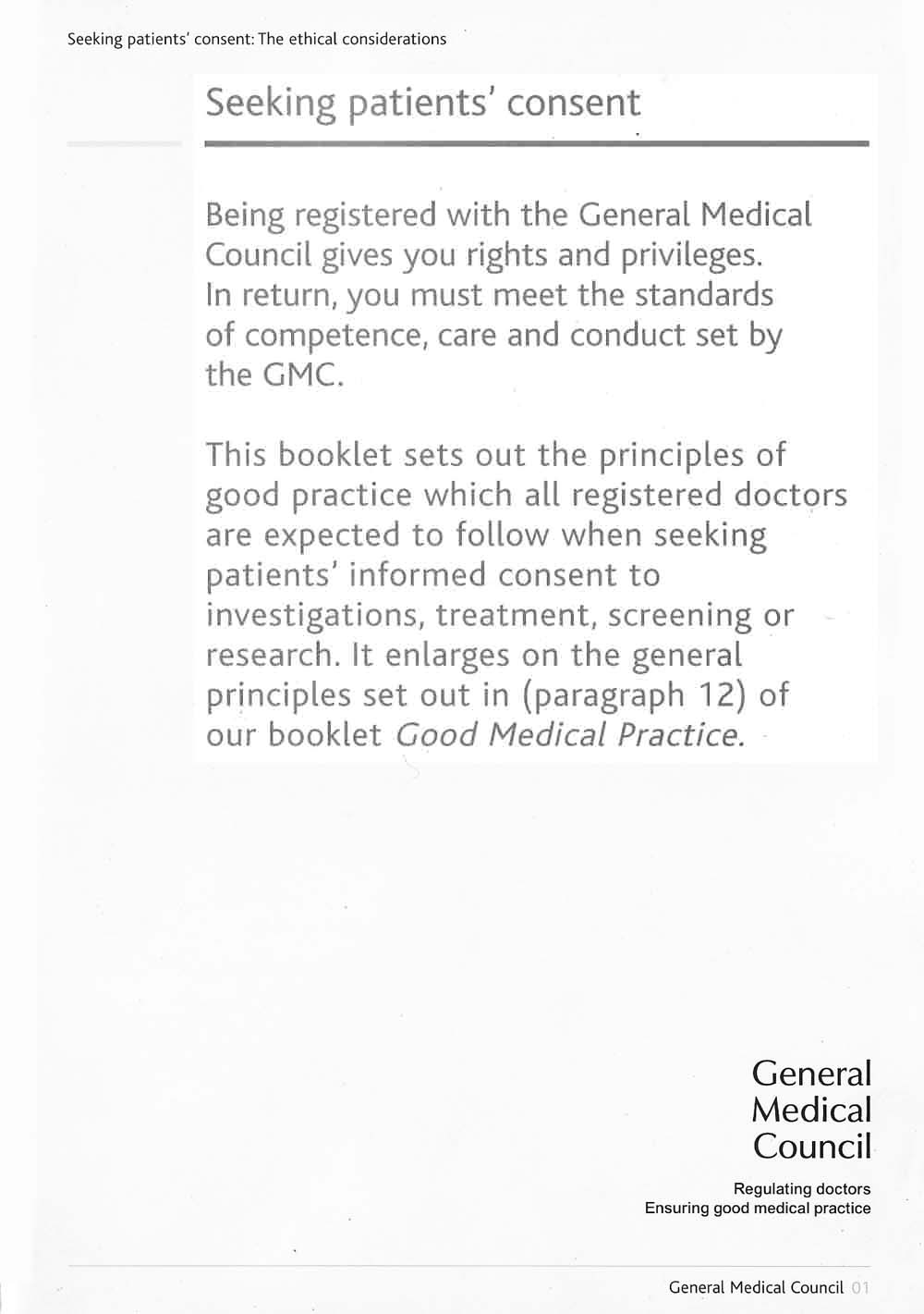 GENERAL MEDICAL COUNCIL BOOKLET :- SEEKING PATIENTS CONSENT CLICK ON PAGE TO OPEN & ONCE MORE TO ENLARGE,THEN CLICK ON BACK BUTTON FOR THE NEXT PAGE. I have marked in red those points which I believe the doctors ignored or contravened. FRONT COVER INSIDE COVER PAGE 01 PAGE 02-03 PAGE 04 PAGE 05 PAGE 06 PAGE 07 PAGE 08 PAGE 09 PAGE 10 PAGE 11 PAGE 12 PAGE 13 PAGE 14 PAGE 15 PAGE 16 PAGE 17 PAGE 18 PAGE 19 PAGE 20 PAGE 21 PAGE 22 BACK COVER