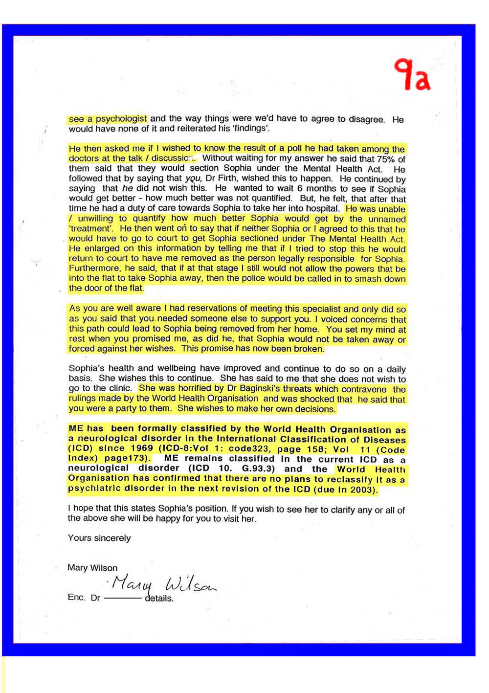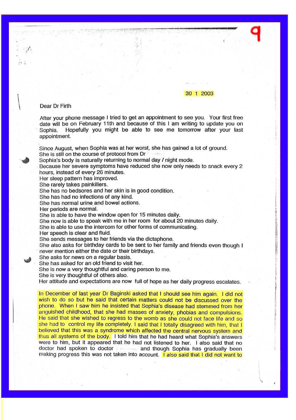 DOC.No. 9 (Mrs.Wilson - Dr Firth, update on Sophia and interview by Dr Baginsk)