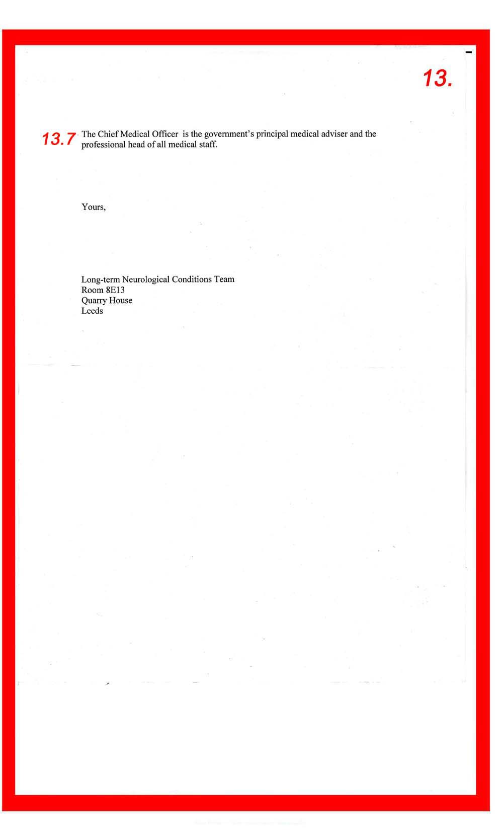 In the letter dated 7th June (author un-named, unsigned and unreferenced), it states that past and present CMOs accept the World Health Organisation (WHO) classification of ME (12.2), and that the “CMO is the Government’s principal medical advisor and the professional head of all medical staff” (13.7), BUT that the General Medical Council (GMC) is responsible for regulating doctors (12.4) And, once again, states that the “NICE clinical guidelines are not mandatory” (12.2). On 4th July a Mrs Pemberton wrote, saying that Mr Walker was, once again, ‘on holiday’. She said that the International Classification of Diseases (ICD) are mandatory in England, but only for that purpose ‘classification’ (15.1). The inference is that such classification does not have to be followed in practice; it appears to be just a paper formula.