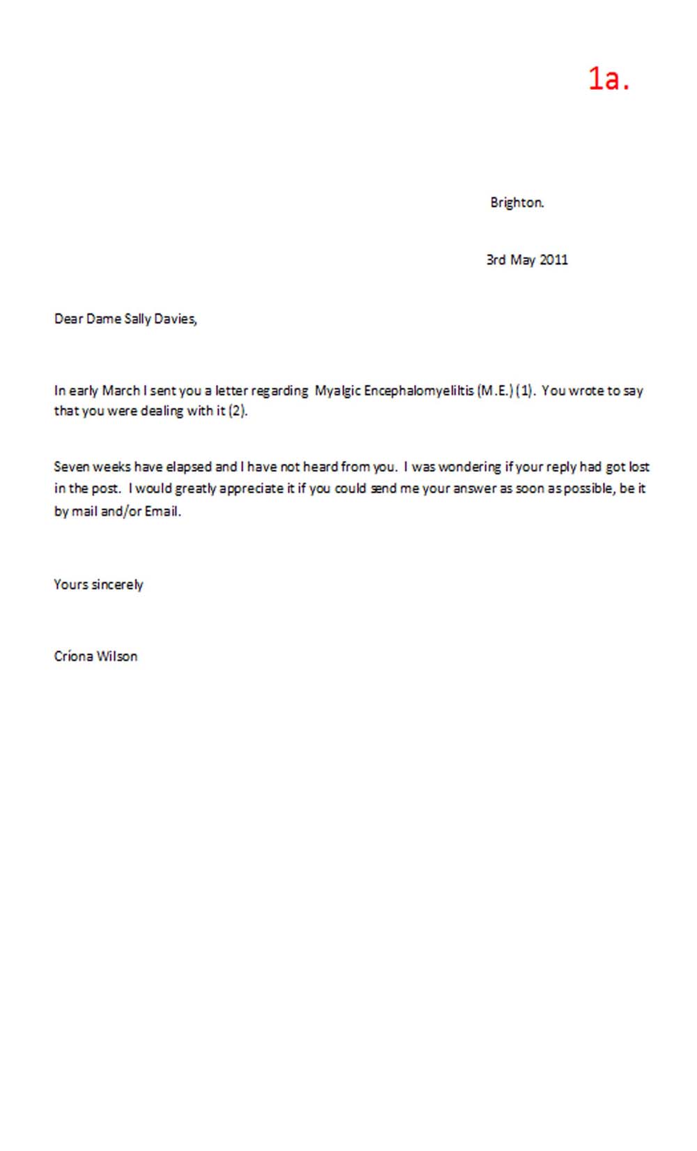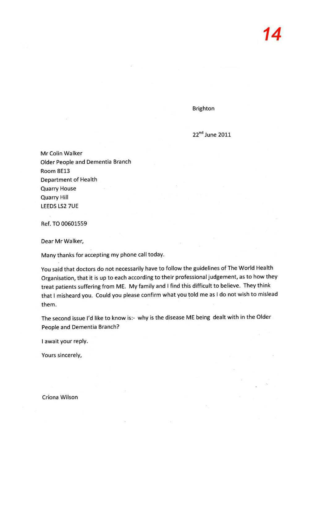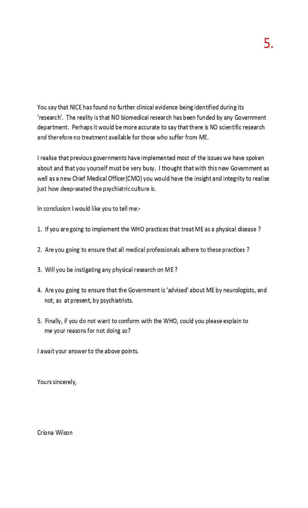 The Chief Medical Officer's (CMO) letter was answered on 26th April by one who had an indecipherable signature, minus a printed name (9.6) On phoning I was told that the said owner was a Mr Colin Walker, who was ‘on holiday’. Mr Walker states that the National Institute for Health and Clinical Excellence (NICE) guidelines were published in 2008 (8.4), as opposed to Mr Burstow’s claim of 2007 (2.4). These guidelines were formulated, despite not knowing the cause of Myalgic Encephalomylyetis (ME)(6.3). These guidelines too, are not mandatory (9.5).