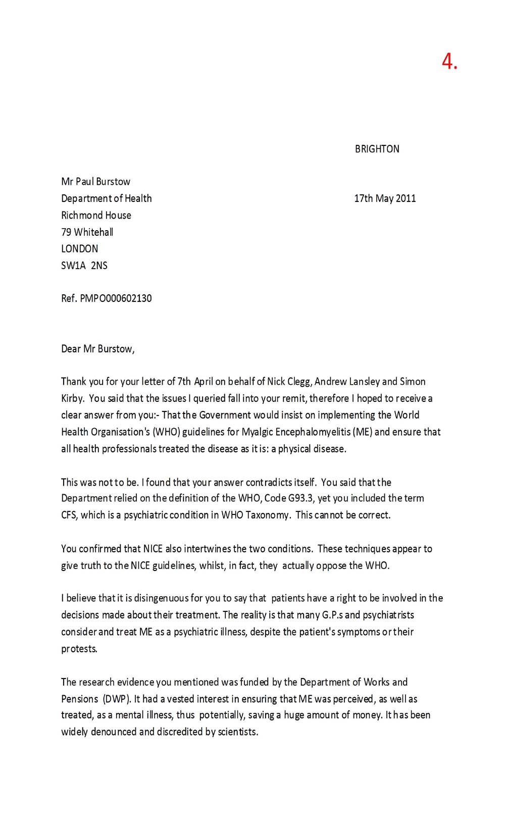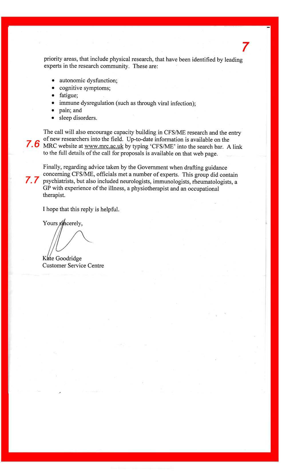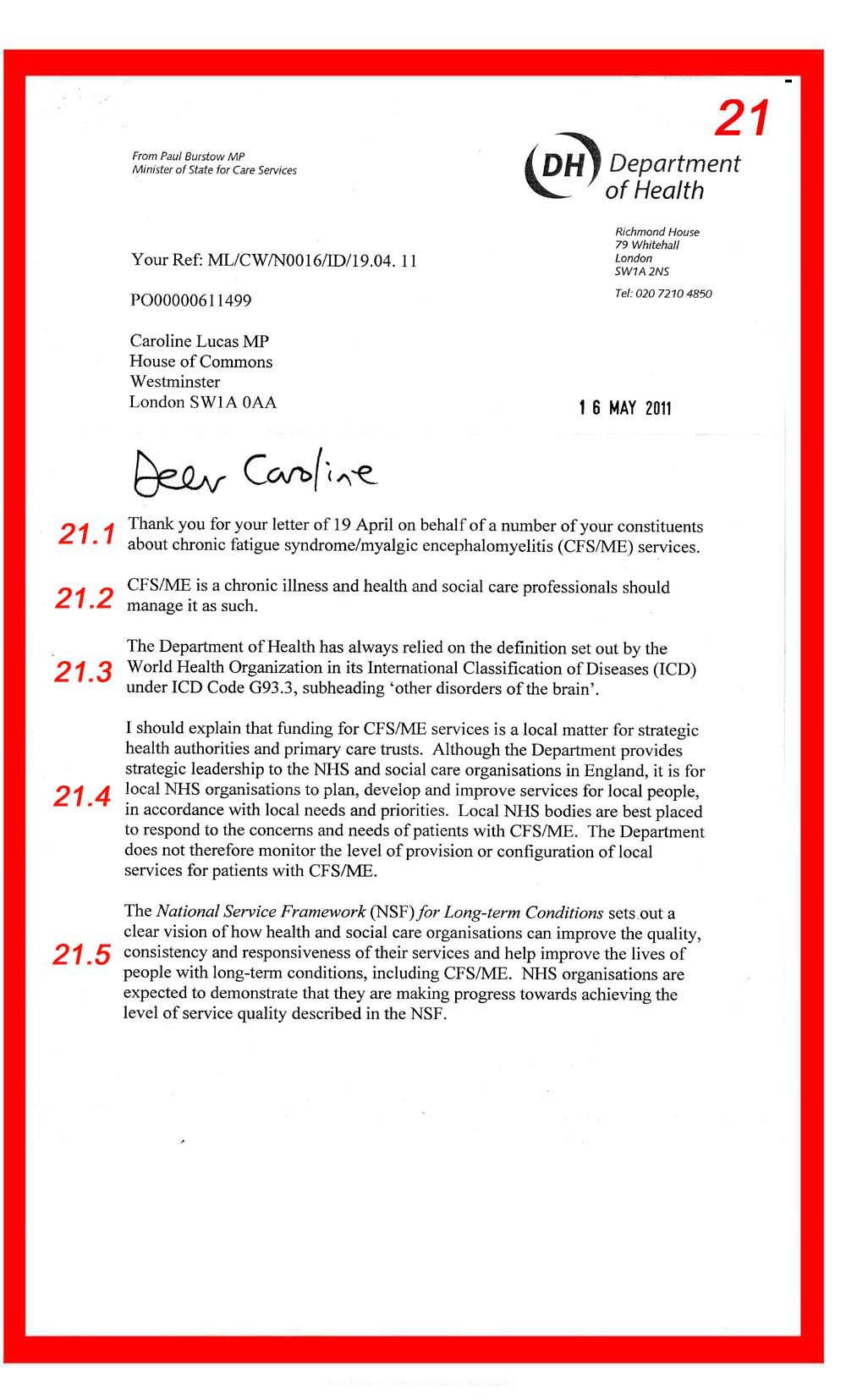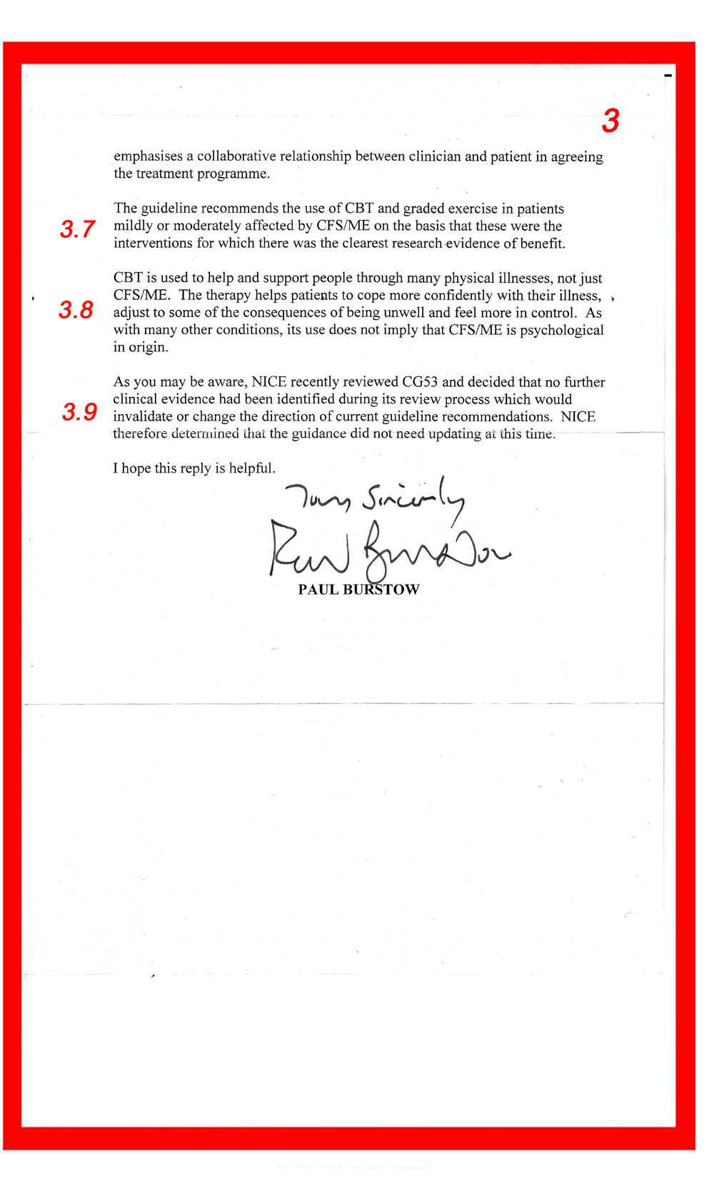 In his letter dated 7th April (2.3) Mr Burstow stated that “The Department has always relied on the definition set out by the World Health Organisation in its International Classification of Diseases (ICD) under ICD Code G93.3.” He said that National Institute for Health and Clinical Excellence (NICE) published guidelines in August 2007 (2.4), but that individual doctors do not have to adhere to these (2.5). That “it does not force patients into treatments they do not want” (2.6). He confirmed that the NICE guidelines regarding Cognitive Behaviour Therapy (CBT) and Graded Exercises were appropriate, as they had the “clearest research evidence of benefit” (3.7) and that NICE saw no need to change their opinion or guidance (3.9). In his letter dated 26th May it was reiterated that it is up to the individual doctor as to whether they treat a patient suffering from Myalgic Encephalomylyetis (ME) as having a physical disease or a mental illness. “The Department does not intervene" (6.2). It said that the Government funds research by the Medical Research Council (MRC) (6.4). As late as 2005 the MRC wrote to my then MP stating that there was “no need to fully understand underlying causes or triggers for those with ME” p3 |